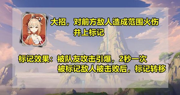 大招对前方敌人造成火元素伤害,并对其中一名敌人上标记。标记有两种效果:(1)队友的任何攻击都会引爆标记,(2)击败被标记的敌人后,标记会转移到附近的敌人身上,(3)标记可以频繁引发爆炸,但有2秒冷却时间。激活天赋2后,大招提升队友10%的攻击力,并依据天赋1层数额外提升攻击力,最高为队友提升20%的攻击力。唯一不确定的因素是:这个核弹到底是大伊万,还是小核弹?