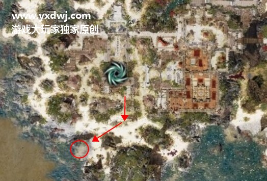 他在营地老大格里夫身后的门出去之后右手边的海滩上。