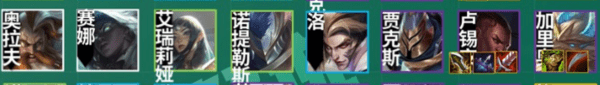 刀妹、奥拉夫、加里奥、塞纳、卢锡安、泰坦、洛、贾克斯。