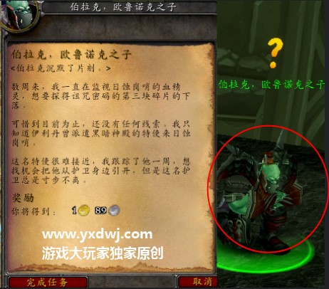 任务需要玩家们找到欧鲁诺克的三个玩家之一,NPC名叫伯拉克,欧鲁诺克之子。