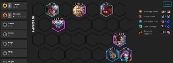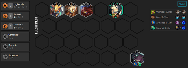 2阶段无龙族:如果2阶段没龙族开局还想玩这套,那这局游戏上9其实很悬,这里给出一个非龙队的打工组合——3盾2征服3哨兵,打连胜很强,可以转很多通用阵容,特点是费用低,综合星级高,全员能抗能打