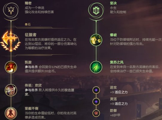 蒙多叠征服者比较快,利用W配合平砍很快就可以叠满层的征服者,既然选择神话装是渴血战斧的出法,基石点征服者的输出效率明显会更高。凯旋能增加蒙多的收割回复,按照已损失生命值回复,比较契合蒙多的特点。欢欣增加攻速,提升蒙多的输出效率。底层符文点坚毅不倒可以配合蒙多的E技能打出更高的输出效果。