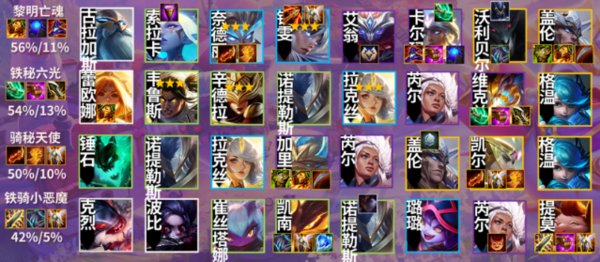 版本T0阵容就3个,1星卢锡安锁血2星卢锡安强势到5阶段的铁骑炮,为了对付丧尸九五,要么需要三星卢锡安要么需要上9人口找两星的阿克尚,丧尸九五虽然削弱了但依然是版本的神,青龙大天使的大头2星几乎等于内战搏吃鸡,另外就是完克物理体系来吃分的铁骑努努了,努努特别吃铁骑转,所以稳定性不如兔子分享的铁骑破败,有转职可以玩。