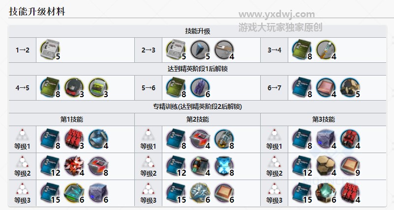 详细的技能1-7的升级所需材料,还有技能专精需要的材料,都给大家列在了下面。