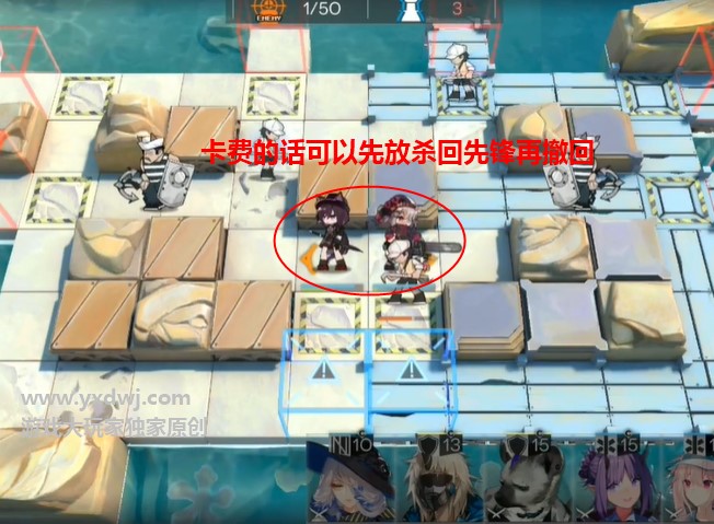 首先根据下面的位置摆放两个近卫,随便什么都可以,也可以先放先锋完了再撤回换输出高的近卫。