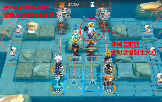 再最后一波涨潮之前,把这个T放到两个奶后面,吸收弓箭手的伤害,防止奶被射死。