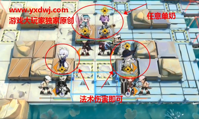 现在左右下面两个地方放两个法术伤害,法师,辅助角色,都可以,但是要是法术伤害。