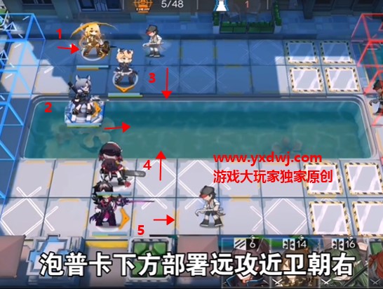 首先根据下面的顺序分别放置两个向日葵先锋,法术近卫,群体近卫,远卫。