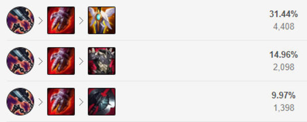 血手则提供生命值加成,且生命值过低时提供护盾保护,核心思路和渴血一样,两者配合进一步提升皇子切入后的自保能力。最后一件装备根据战况合理选择,例如敌方回复英雄较多,则反甲是不错的选择,或团队依赖我们的切入开团,则选择复活甲。最后或考虑提升我们自身输出,则选择黑切。
