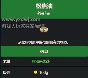 玩家可以在农场的松树上放置树液收集器,或者在自然生长的松树上(如煤矿森林的树)获得松焦油。
