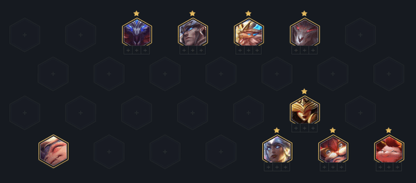 这套阵容的玩法是龙族转九五,场上需要的5费英雄比较多,最后也不一定非要升9人口,在8人口时大头达到二星后就能成型。