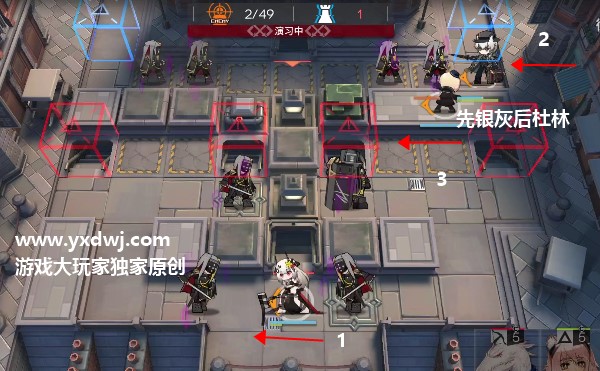 等费用在入口下泥岩单守,然后右上角先下银灰再下杜林,杜林闪避法师攻击。