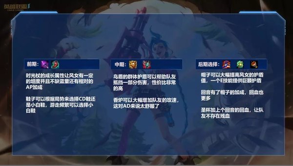 风女的出装有很多种,目前最强的还是时光这套,在时光的加持下,风女会有不错的坦度,即使吃到几个技能也不会导致需要直接回家,第二件鞋子可以根据情况来选择是小白鞋还是CD鞋,如果需要频繁游走,小白鞋是最好的选择,如果下路优势很大并且不需要游走,可以选择CD鞋减少技能CD来保护AD,附魔的话如果游走频繁可以选择救赎,队友发育比较好也可以选择鸟盾,鸟盾会相对贵一些节奏慢一些,救赎适合前期的快节奏建立优势,帽子可以大幅提升风女E技能的护盾值和R技能的治疗回血,并且对辅助装来说也是收益非常高的装备,如果我方AD发育不错可以选择香炉,如果我方法师发育很好或者没有法师的情况下可以出流水法杖,后面可以选择回音和圣杯来提高治疗回血的效果。