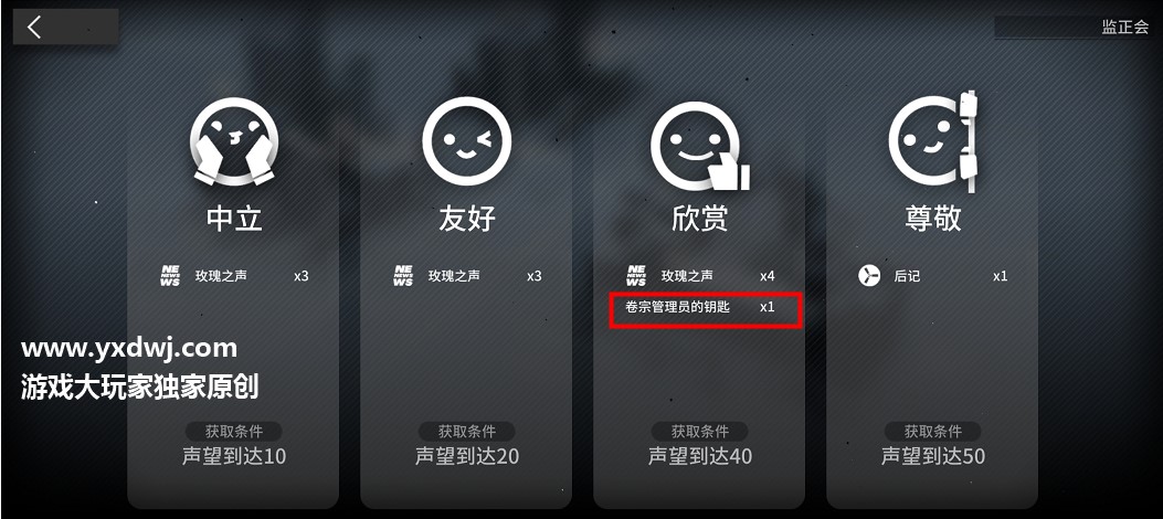 在声望奖励里面我们可以看到欣赏的声望等级奖励里面就有卷宗管理员的钥匙这个道具。
