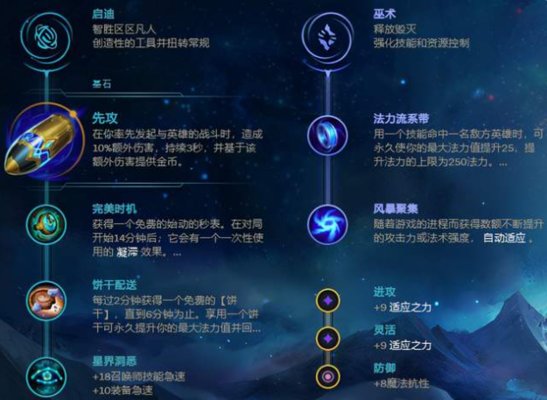 基石符文点出先攻,加快维克托的发育,尽早做出核心装备进入强势期,小天赋选择秒表保证维克托发育期间的生存能力,饼干提供一定的线上续航,最后点出星界洞悉,加快召唤师技能和装备技能的CD,让维克托在神话之后有更强的生存能力。