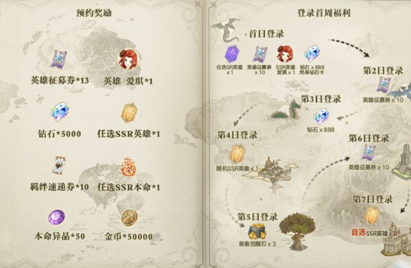 首日登录奖励:任选SR英雄、英雄招募券*10、SSR英雄爱琪、钻石*888、终身钻石卡