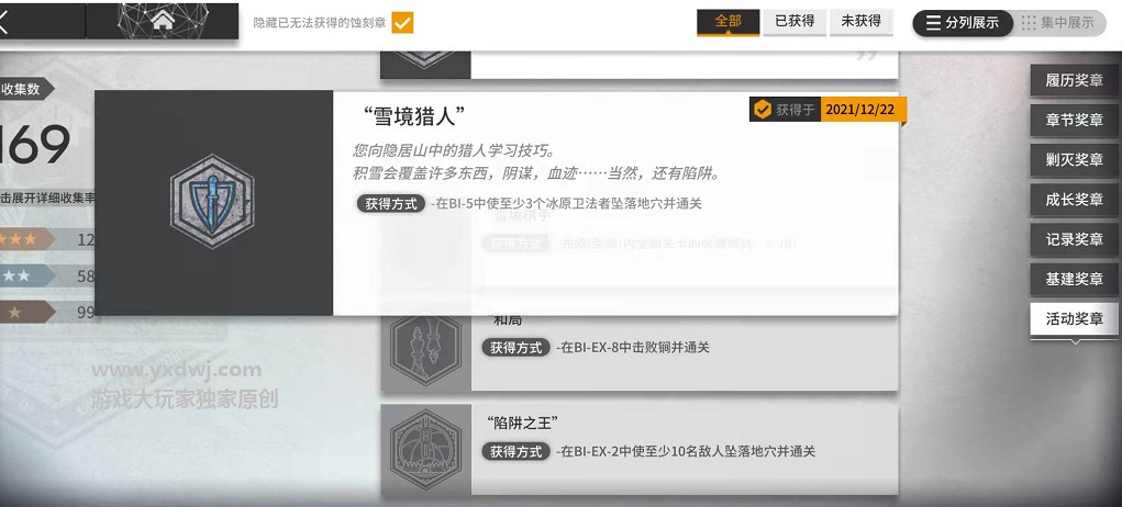 很多的玩家们点开这个风雪过境活动里面的蚀刻章,应该都会发现有一个雪境猎人的章没解锁。