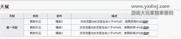 首先我们看天赋,精二攻击范围内友方血量40以下减伤20,中规中矩的一个效果。