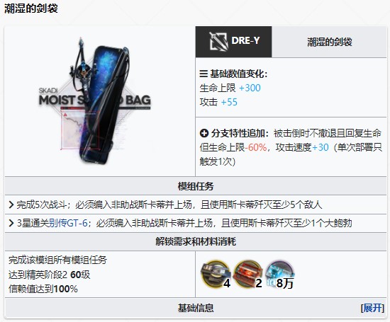 斯卡蒂模组解锁需要到达精英阶段2 60级且信赖值达到100%