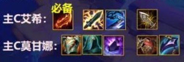 开局拿弓,优先羊刀,有香炉海克斯不做羊刀给传送门,看似吃的弓很多其实装备都可替代,优先莫甘娜装备,不用追求完美,尽量找个水银搭配两个肉即可,反甲石像鬼传送门龙牙泰坦救赎狂徒都吃,艾希主要是帮队友减魔抗和对付高血量单位靠群体打输出而不是但单C,多余装备看着适合给即可。