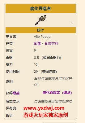 腐化吞噬者是一种在困难模式之前可以制造的召唤武器。它会召唤一个灵魂吞噬者的婴儿仆从。