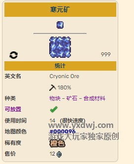 寒元矿是一种困难模式在击败极地之灵后在地下雪原生成的矿石,它被用于在精金熔炉或钛金熔炉中制作寒元锭。