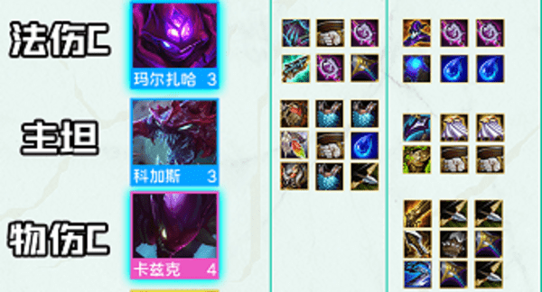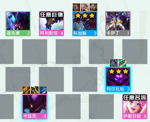 玛尔扎哈(外号蚂蚱)和科加斯(外号大虫子)和卡兹克(外号螳螂)是本阵容3大C位,他们三分分别消化法伤、肉装、物理3类散件,主张谁肥谁吃名流的原则站位,后期根据科加斯是否能3星决定是上2巨像还是上3名流,有转职上7变异。