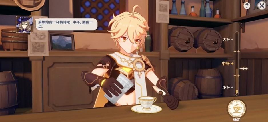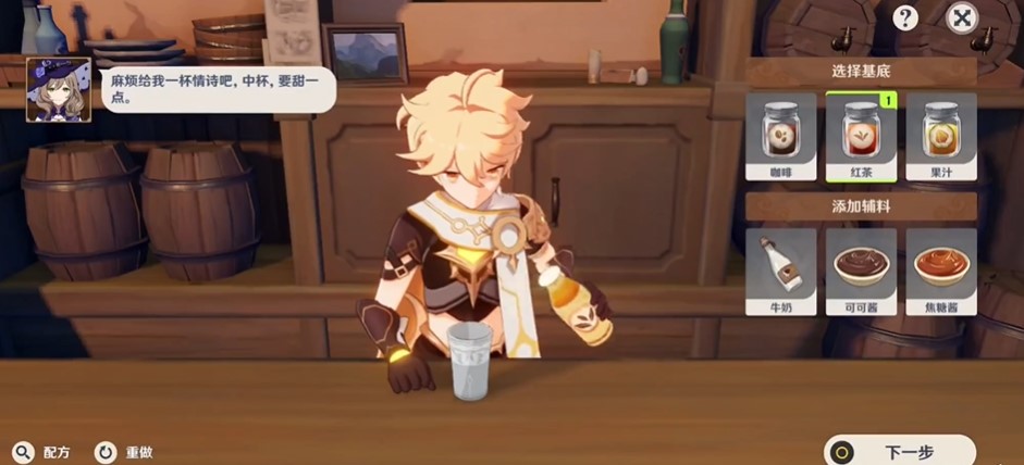 1.首先,进入原神调酒界面,丽莎需要一杯稍甜的中杯情诗,所以在情诗基础的搭配上多加一份焦糖