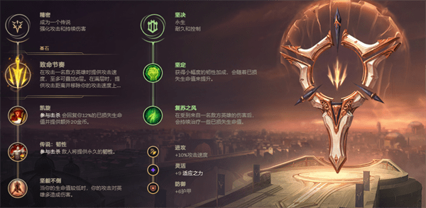 主系选择精密,点致命节奏,这样能够给蛮王带来高额的攻速加成,弥补蛮王的攻速缺陷,后续点出凯旋,增加英雄续航能力,再点韧性和坚毅不倒,蛮王大招时是可以轻松的触发坚毅不倒的增伤效果的。