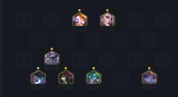 3阶段 :3-2升级6人口,看打工阵容的情况添加强势棋子,如果白嫖到雷欧娜可抛弃3约德尔上4保镖+2黑魔,烈娜塔装备先给予蚂蚱打工。4保镖在3/4阶段强度非常高,稳血能力极强。