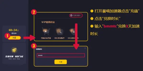 这里有个方法可以白嫖到3天的暴喵加速时长,点客户端左侧充zhi,找到兑换时长,输入bmmtc可以获得,需要的小伙伴可以试试。