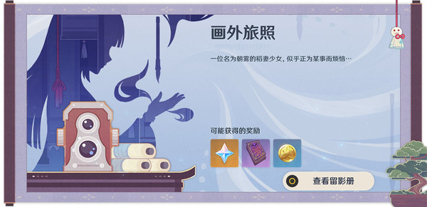 1、与稻妻城内的朝雾对话,完成引导任务画外旅照后,可查看朝雾的留影委托。