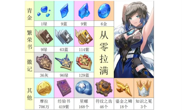 除了以上其他之外,还需要706万摩拉、419本紫色经验书,168个星螺、46个符文之齿、18个鎏金之鳞、3个知识之冕。