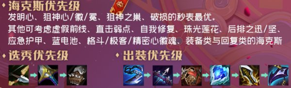 其他可考虑虚假前线、并肩作战、直击弱点(不要银色,可不出装轻语)、自我修复、珠光莲花、后排之迅/坚、应急护甲、蓝电池、格斗/极客/精密心徽魂、装备类与回复类的海克斯。