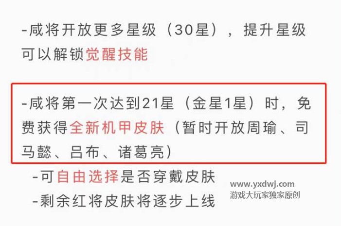 获得机甲皮肤的条件:咸将第一次达到21星(金星1星)时,免费获得全新机甲皮肤。