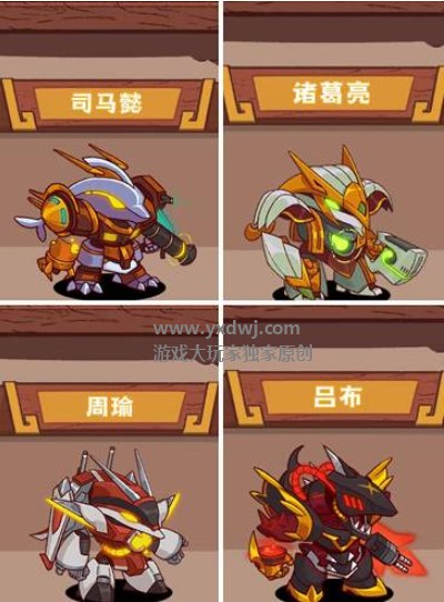 分别为司马懿—机甲皮肤、诸葛亮—机甲皮肤、周瑜—机甲皮肤和吕布—机甲皮肤。