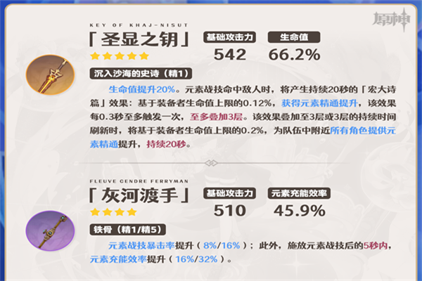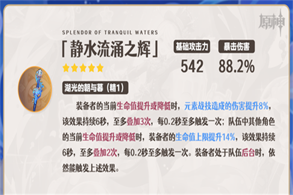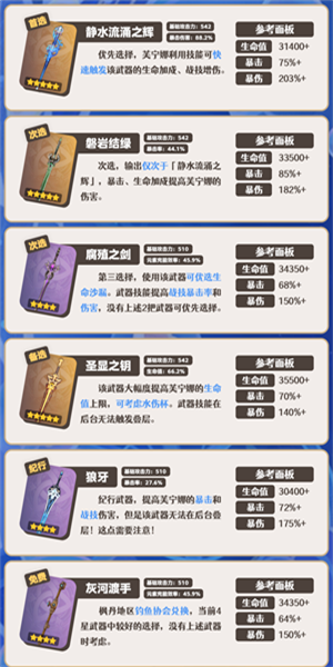 ①输出武器的次选,与「静水流涌之辉」的差距最小。副属性暴击率加成降低芙宁娜的暴击率需求,此时圣遗物可以优先考虑堆叠暴击伤害、百分比生命加成。