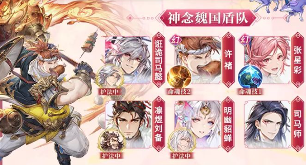 神念盾辅队的平替,此套阵容只有诳诡司马懿、命魂星彩、凛煜刘备、明幽貂蝉是固定的,剩下两个位置可在命魂许褚、命魂曹丕以及司马师中三选二。