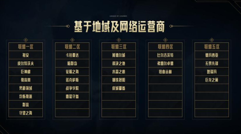 1、拳头把29给大区分为8个大区,其中艾欧尼亚、黑色玫瑰、峡谷之巅是独立的,其他26个大区按照地域和运营商划分为5个联盟大区;