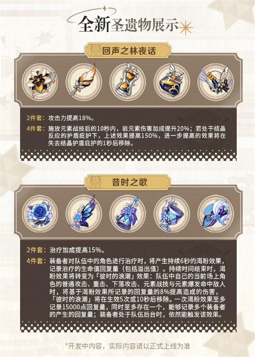 4件套:装备者对队伍中的角色进行治疗时,将产生持续6秒的渴盼效果,记录治疗的生命值回复量(包括溢出值)。