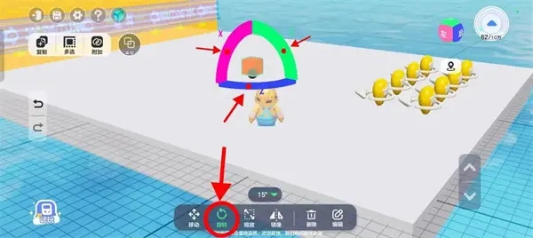 4、点击【旋转】,出现粉、绿、蓝条,拖动即可调整视角。