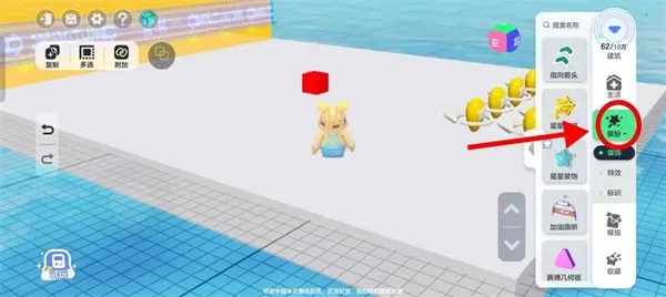 2、点击积木,右侧向上滑动可以找到【装扮】,我们可以给积木贴纸,换颜色。