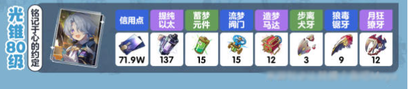 光锥80级:需要信用点71.9w、以太137个、蓄梦元件15个、流梦阀门15个、造梦马达12个、犬牙3个,狼牙9个、月牙12个。