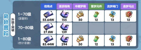 1-70级:需要信用点55.64w、漫游指南155本、冷藏梦箱50个、蓄梦元件12个、流梦阀门13个、造梦马达12个。