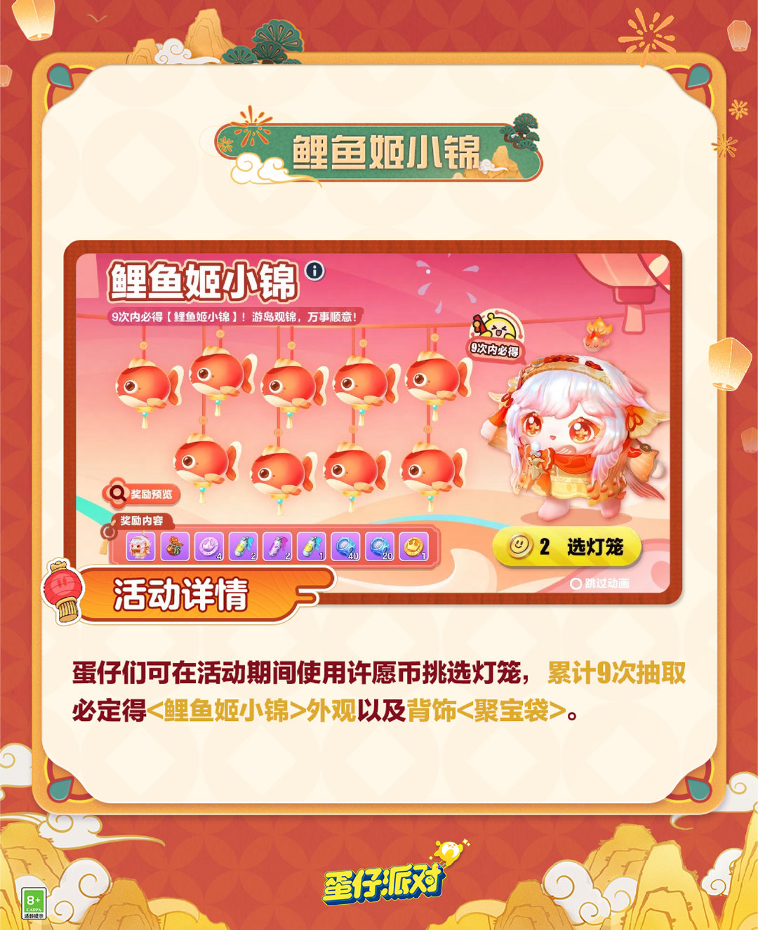 总结:蛋仔们可以在专属活动期间通过使用许愿币来挑选灯笼,累计9次抽取次数就能得到<鲤鱼姬小锦>外观以及背饰<聚宝袋>哦。