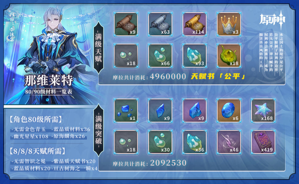 以下是那维莱特天赋突破到满级所需要的所有材料数量。
