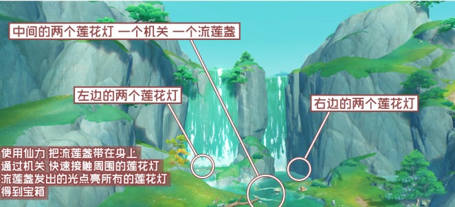 方法:使用仙力,把流莲盏带在身上,流莲盏发出的光点亮所有的莲花灯,得到宝箱。