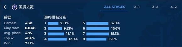 平均排名4.95、前四率40.6%、登顶率7.11%