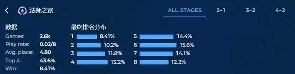 平均排名4.8、前四率43.6%、登顶率8.41%