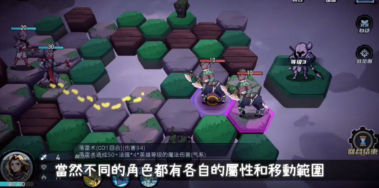 3、不同的角色都有各自的属性和移动范围,英雄角色也可以使用出强大的技能,帮助士兵们战斗。刷完事件就会遇到Boss,挑战成功的话,就可以结束这个关卡啦,然后就利用得到的资源。